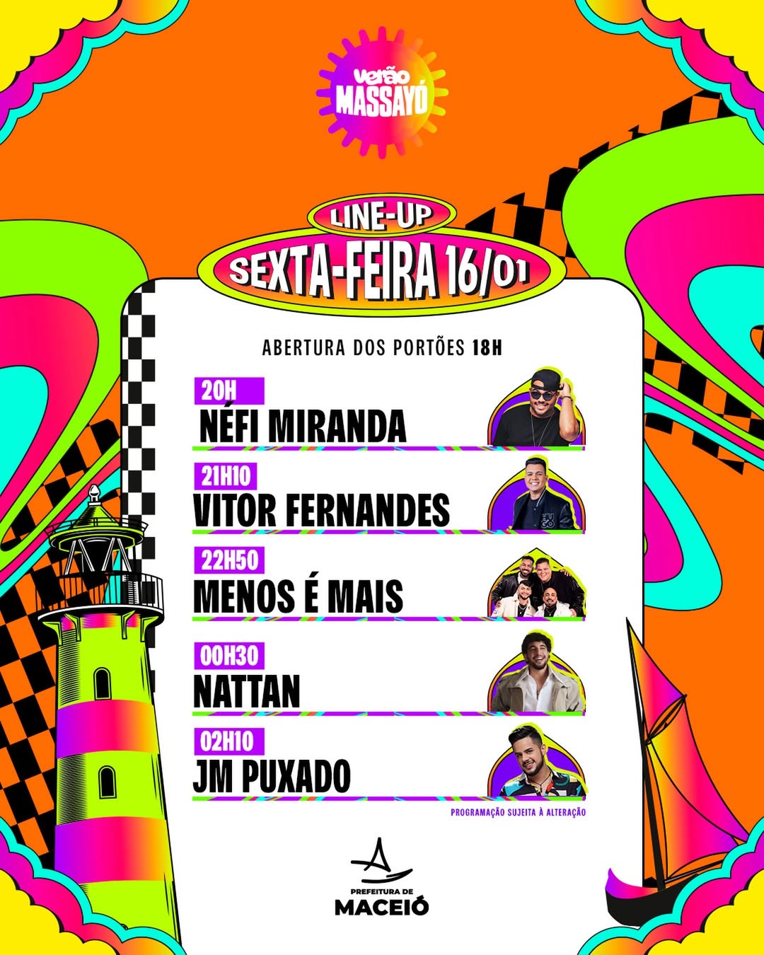 A Prefeitura de Maceió divulgou, nesta quinta-feira (16), a programação com horários das atrações que se apresentam hoje no Verão Massayó 2026, no Estacionamento do Jaraguá. Esse é o primeiro dia de shows do segundo final de semana do festival.