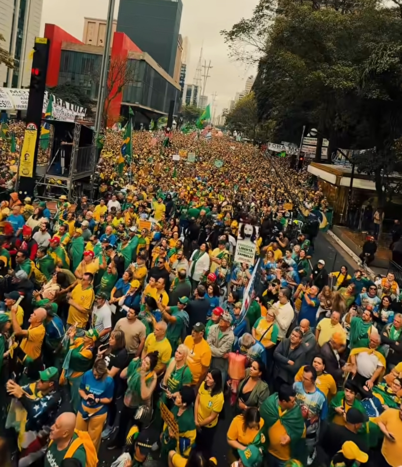 No protesto bolsonarista, liderado pelo pastor Silas Malafaia, os manifestantes pediram anistia aos condenados pelos atos de 8 de janeiro e direcionaram críticas ao ministro Alexandre de Moraes, do Supremo Tribunal Federal. O governador de São Paulo, Tarcísio de Freitas (Republicanos), subiu o tom e chamou Moraes de “tirano”. Faixas em inglês, uma bandeira gigante dos EUA e cartazes com recados a Donald Trump também marcaram o evento.