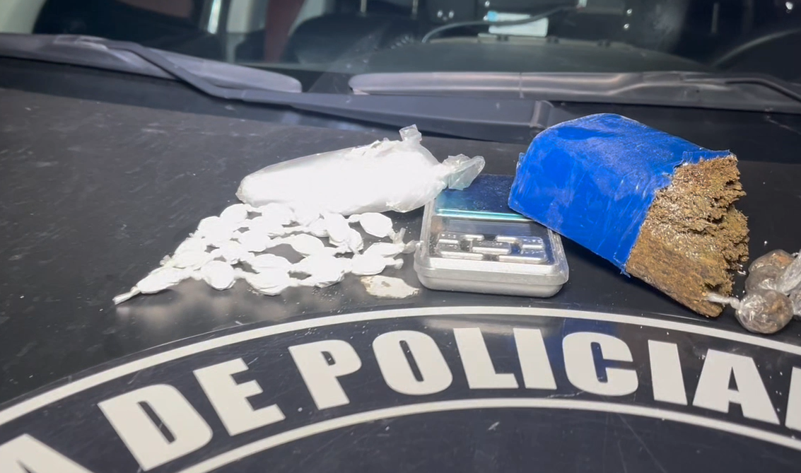 Com o suspeito, os policiais apreenderam porções de cocaína e maconha, além de uma balança de precisão. O material estava em posse do indivíduo no momento da abordagem.