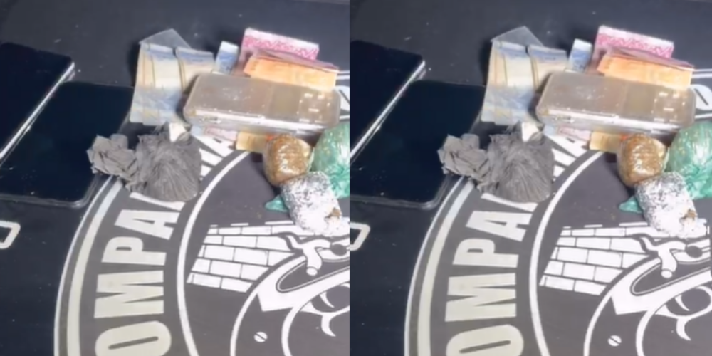 Durante patrulhamento na região, os militares avistaram dois suspeitos em atitude suspeita. Na abordagem, foi constatado que o primeiro indivíduo possuía um mandado de prisão em aberto pelo crime de tráfico de drogas, associação criminosa. Já com o segundo, foi encontrada uma sacola contendo maconha, cocaína, dinheiro trocado, dois aparelhos celulares sem chip e uma balança de precisão, caracterizando o tráfico de entorpecentes.