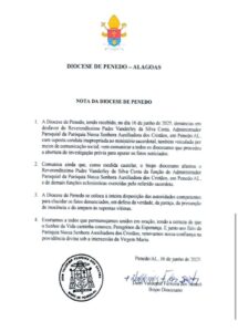 A Diocese de Penedo comunicou na noite desta segunda-feira (16), o afastamento cautelar do Padre Vanderley da Silva Costa, que exercia a função de Administrador Paroquial da Paróquia Nossa Senhora Auxiliadora dos Cristãos, em Penedo (AL). A decisão foi tomada após denúncias que indicam suposta conduta inadequada do sacerdote no exercício do ministério.