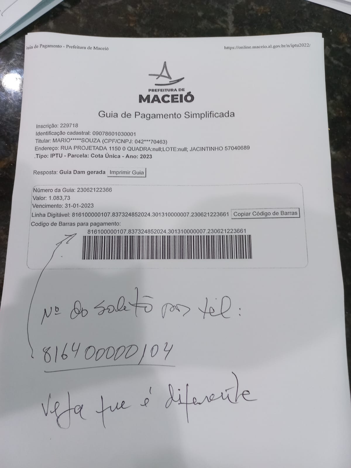 Os 12 primeiros algarismos do boletos eram diferentes. É desta forma que o dinheiro é desviado já que são os primeiros dígitos que direcionam o valor para a determida conta. O resto dos número eram idênticos e o endereço do imóvel e valor do IPTU, de R$ 1.087,73.