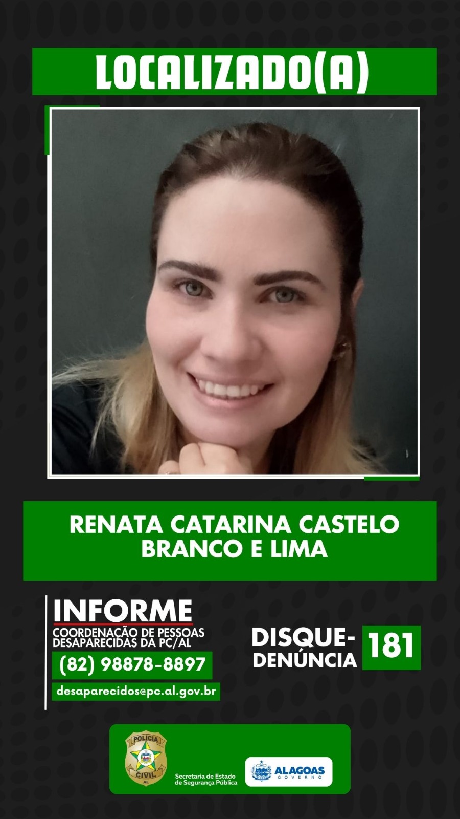 Renata Catarina Castelo Branco e Lima, de 37 anos, filha do ex-prefeito de Porto Calvo Carlos Eurico Leão e Lima e sobrinha da atual prefeita Eronita Sposito Leão e Lima (MDB), foi localizada após ter desaparecido em Maceió. Ela havia sido vista pela última vez na quarta-feira (13), no Shopping Pátio, no bairro Benedito Bentes.