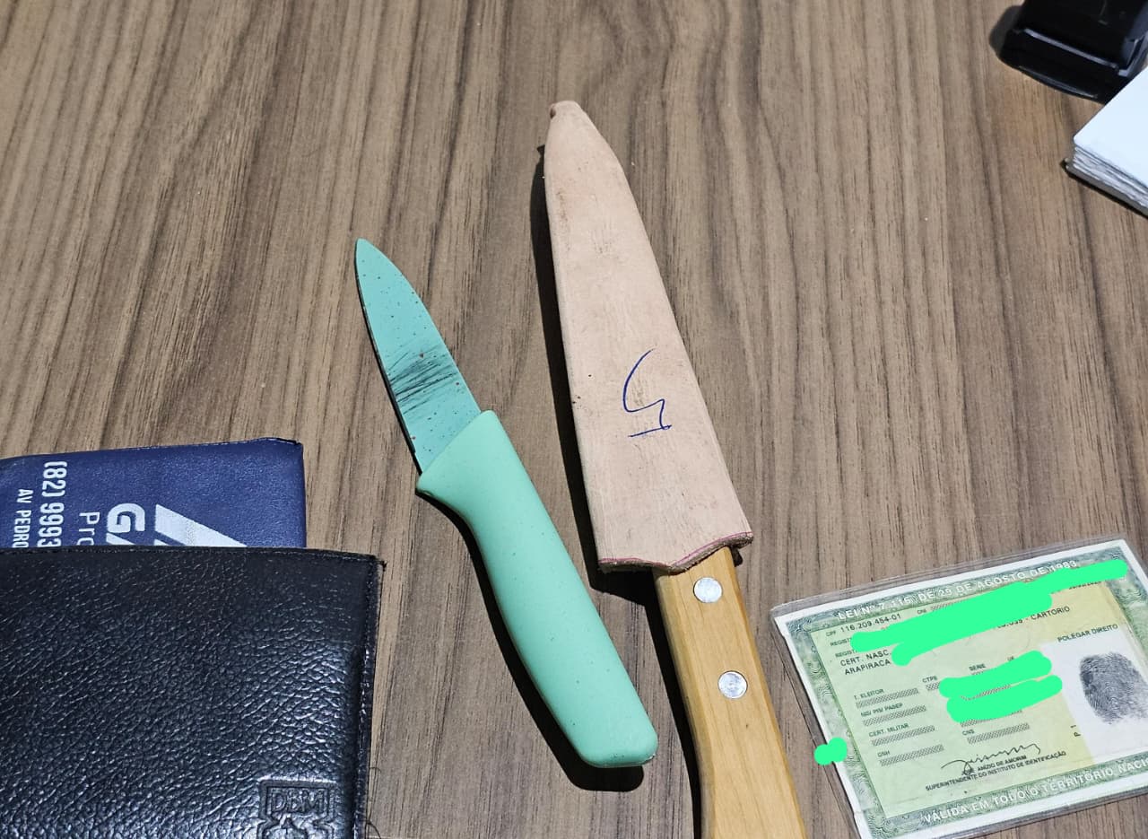 Durante a abordagem, os agentes identificaram que ele portava duas facas do tipo peixeira. Por apresentar comportamento agressivo e estar emocionalmente alterado, o suspeito foi algemado e encaminhado à Central de Polícia Civil de Arapiraca, onde permanece à disposição da Justiça.