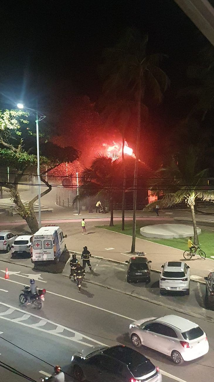 Moradores da orla registraram imagens do fogo consumindo a barraca e da fumaça que se espalhou pela região.