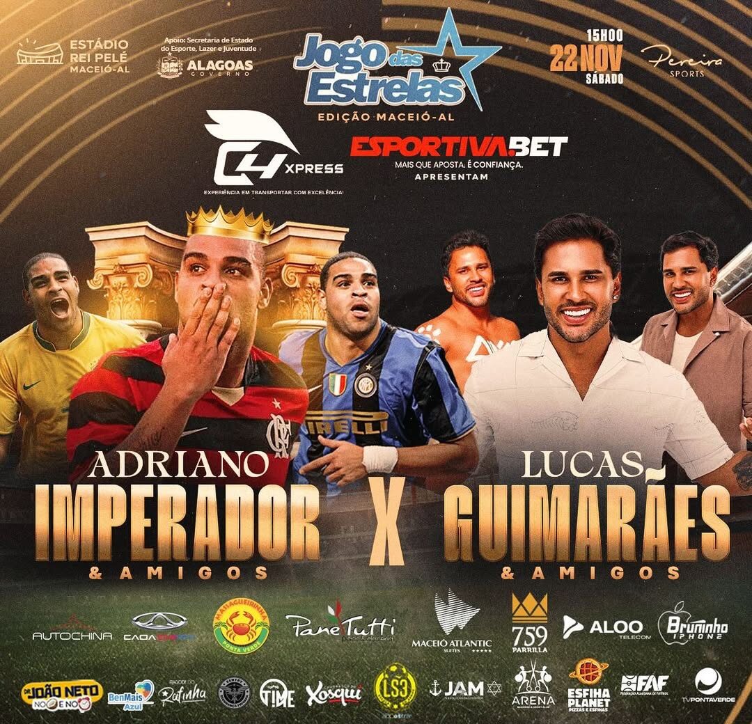 O Estádio Rei Pelé, em Maceió, será palco de um espetáculo inédito no dia 22 de novembro: o Jogo das Estrelas, que colocará frente a frente os Amigos do Adriano Imperador e os Amigos de Lucas Guimarães. O evento promete unir futebol, carisma e entretenimento em uma noite que deve lotar as arquibancadas e encantar o público alagoano.