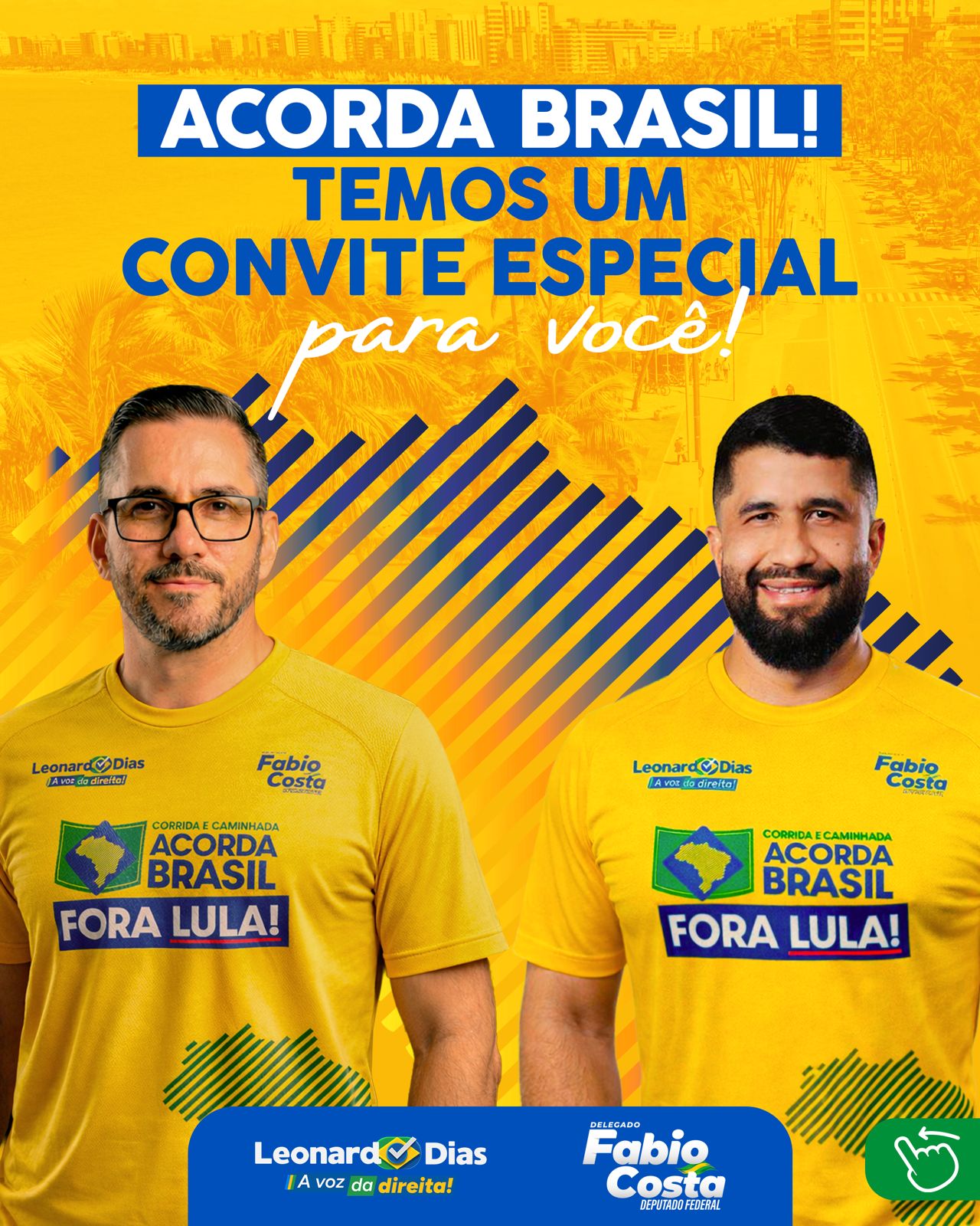 O vereador Leonardo Dias (PL) e o deputado federal Delegado Fábio Costa (PP) anunciaram a realização da Corrida e Caminhada Acorda Brasil: Fora Lula, no dia 17 de maio. O evento será realizado na orla da Pajuçara, em Maceió, com largada prevista para 6h da manhã. A iniciativa visa unir atividade física a um ato público de caráter patriótico e de manifestação política. De acordo com os organizadores, o evento não é voltado apenas para atletas profissionais. A proposta é reunir pessoas de diferentes perfis que desejam participar de uma manifestação pacífica em defesa de mudanças no país. Por isso, além da corrida, haverá a opção de caminhada, permitindo que outras pessoas possam integrar o movimento.