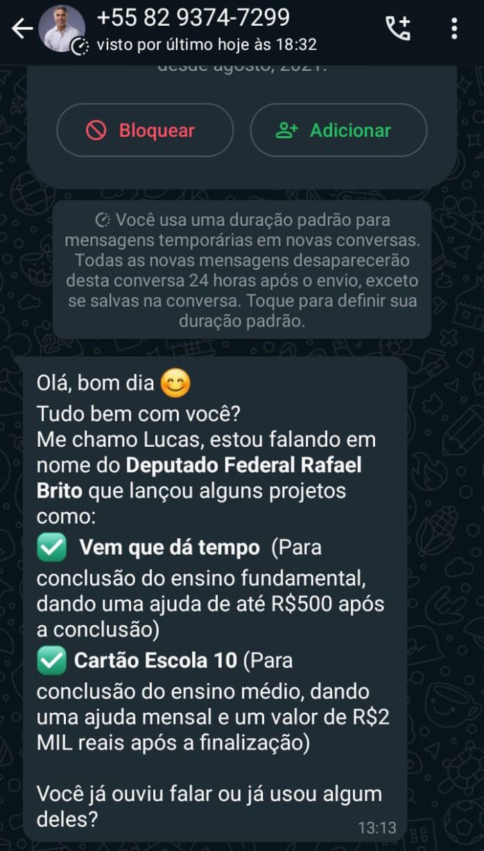O print de uma mensagem enviada via Whatsapp por uma pessoa que se identifica como Lucas, com imagem de perfil do pré-candidato Rafael Brito (MDB), tem levantado questionamentos na web, de que Tio Rafa estaria usando a prática irregular de ‘disparo em massa’. Se assim comprovada, a prática pode ser considerada abuso de poder político e econômico.