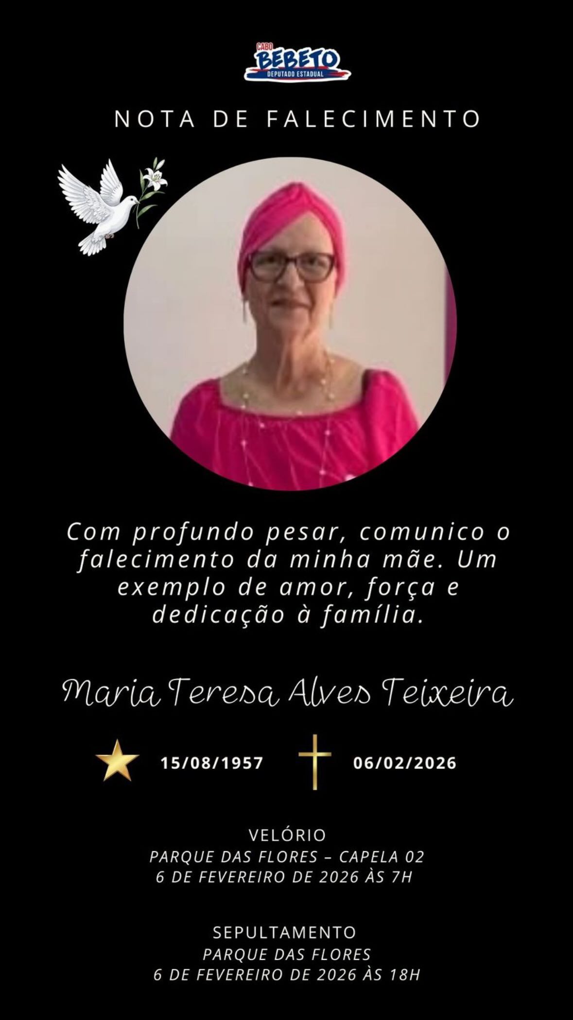 Nesta sexta (6), o deputado estadual Cabo Bebeto e o vereador Caio Bebeto comunicaram o falecimento de Maria Teresa Alves Teixeira, mãe do deputado.