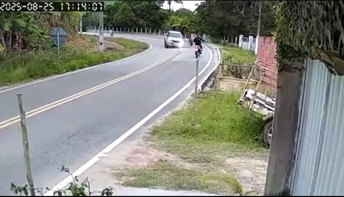 Um vídeo de uma câmera de segurança mostra o momento em que um motociclista quase é atingido por um pneu que se soltou de uma caminhonete em movimento, na comunidade Bom Despacho, em Passo de Camaragibe, no interior de Alagoas.
