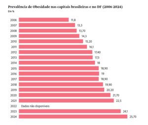Dados do Vigitel, sistema do Ministério da Saúde, mostram que a obesidade mais que dobrou no Brasil nos últimos 19 anos. O índice de adultos obesos nas capitais e no Distrito Federal passou de 11,8% em 2006 para 25,7% em 2024, um aumento de 118%. O crescimento foi registrado tanto entre mulheres, que saíram de 12,1% para 26,7%, quanto entre homens, que passaram de 11,4% para 24,4%.