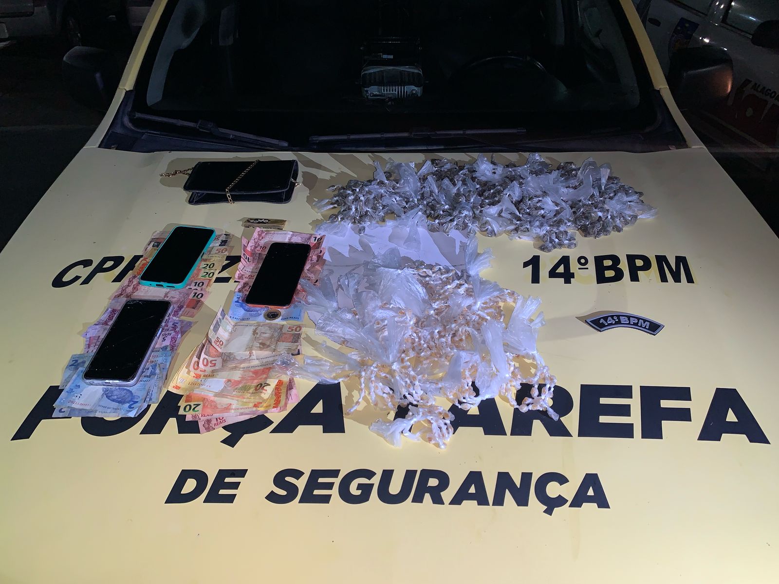 Durante a abordagem, foram localizadas 784 trouxinhas de maconha (486 gramas), 665 pedras de crack (120 gramas), três aparelhos celulares e uma quantia R$ 179, em espécie.