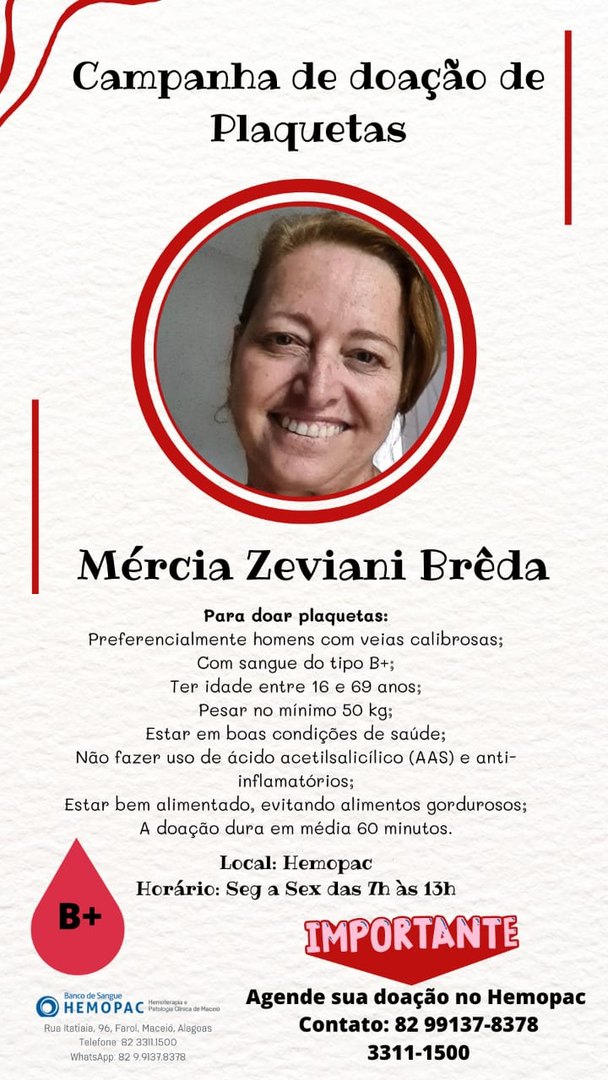 Paciente internada em estado grave necessita com urgência de doação de plaquetas. A paciente é enfermeira e professora da Escola de Enfermagem e da Faculdade de Medicina da Universidade Federal de Alagoas. As doações devem ser feitas no Hemopac com agendamento prévio, de 7 às 13 horas, em nome de Mércia Zeviani Brêda.