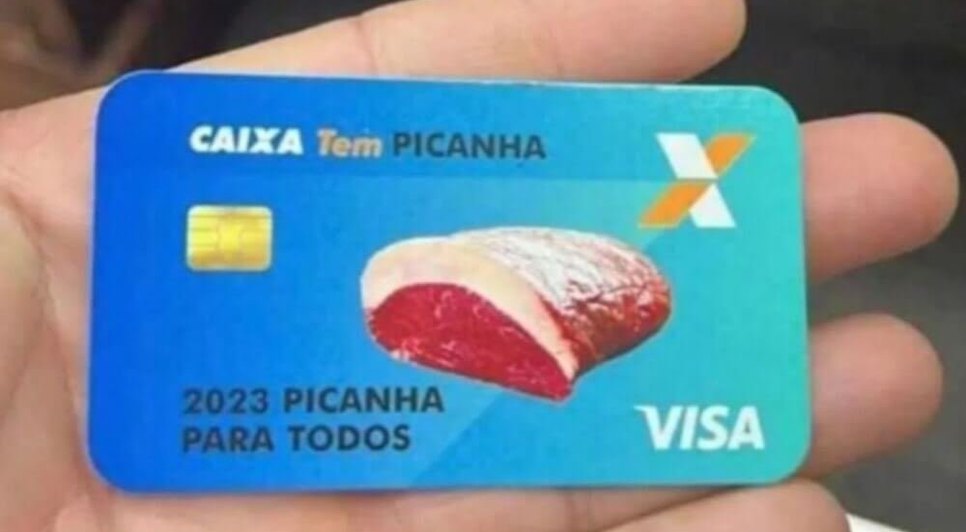 A outra imagem mostrava um cartão da Caixa Econômica Federal (CEF) com a foto de uma peça de carne e a frase escrita “picanha para todos”.