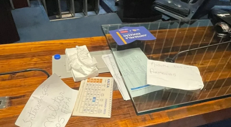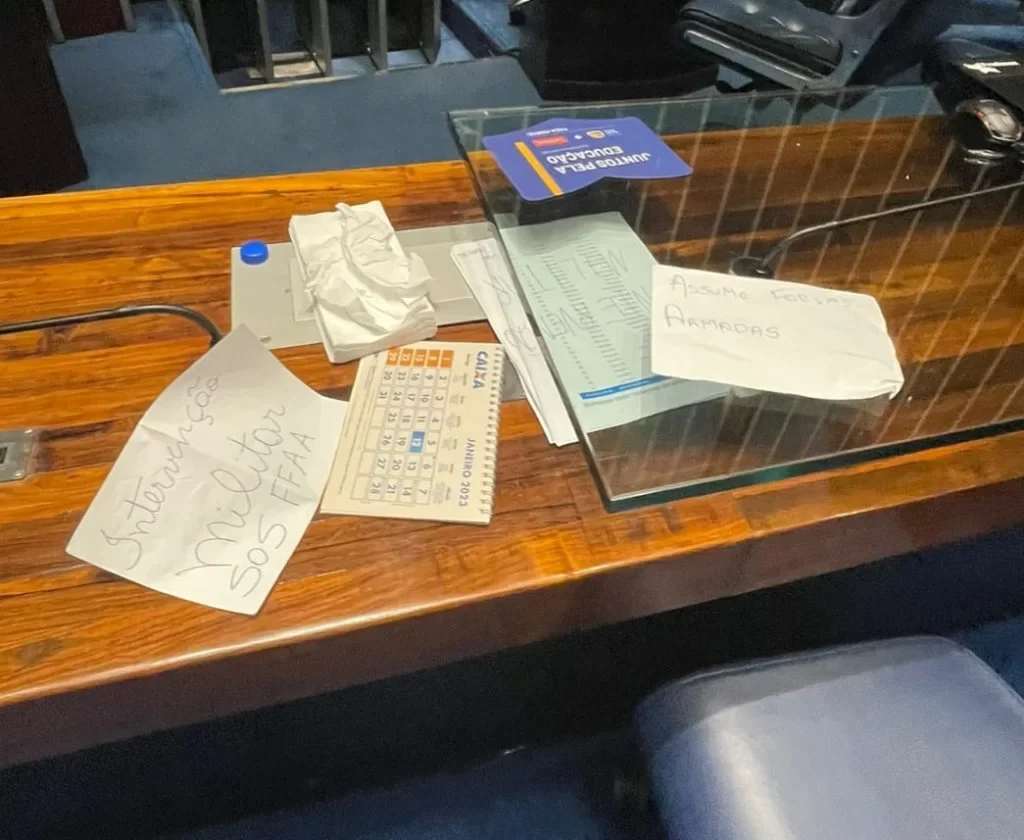 As mensagens foram manuscritas, sempre assinadas "povo brasileiro" e teriam sido encontradas espalhadas no plenário em meio à destruição deixada pelos invasores .