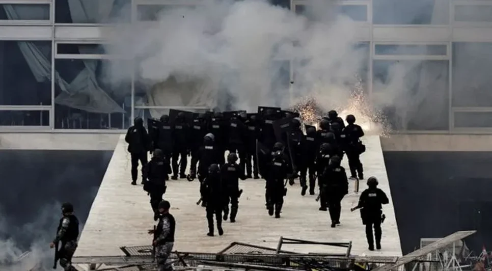 Um vídeo divulgado pelo jornalista Renato Alves do portal O Tempo mostra manifestantes utilizando o sistema de incêndio do Congresso para repelir policiais legislativos durante invasão da Câmara.