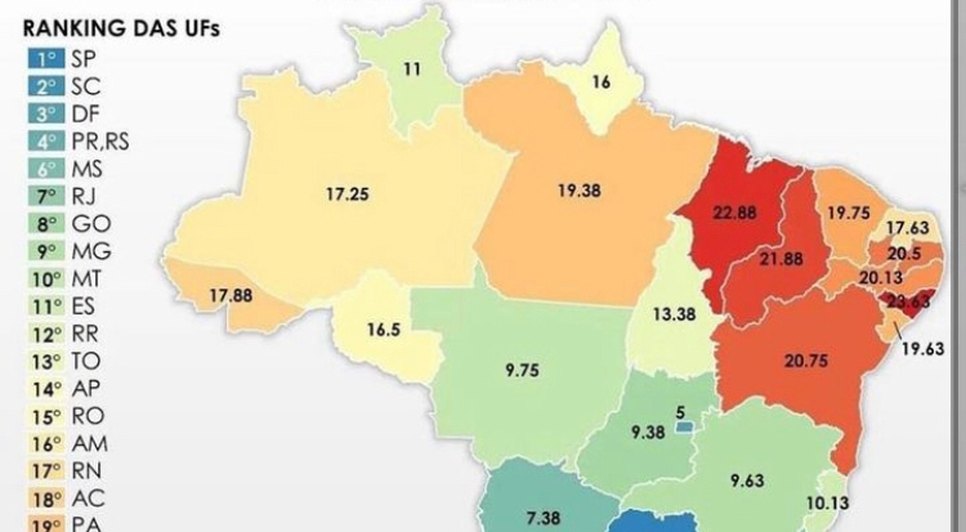 São Paulo ficou na primeira colocação, com um índice de 3,25, seguido por Santa Catarina e Distrito Federal no top-3 do país.