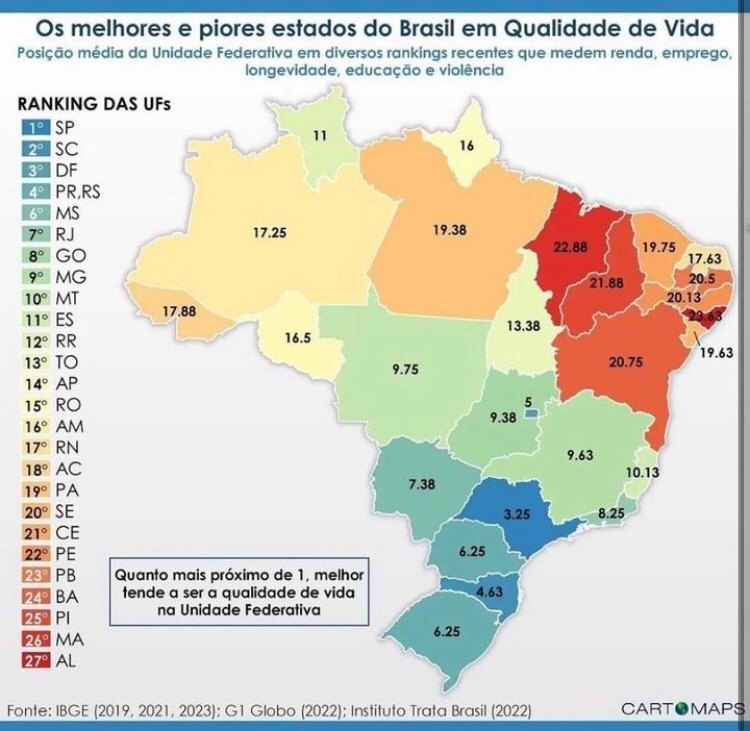 O ranking leva em consideração vários aspectos da população, como renda, emprego, longevidade, educação e violência. Quanto mais próximo de 1 for o índice do estado, melhor a qualidade de vida.