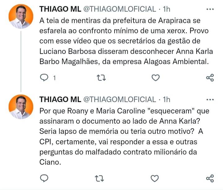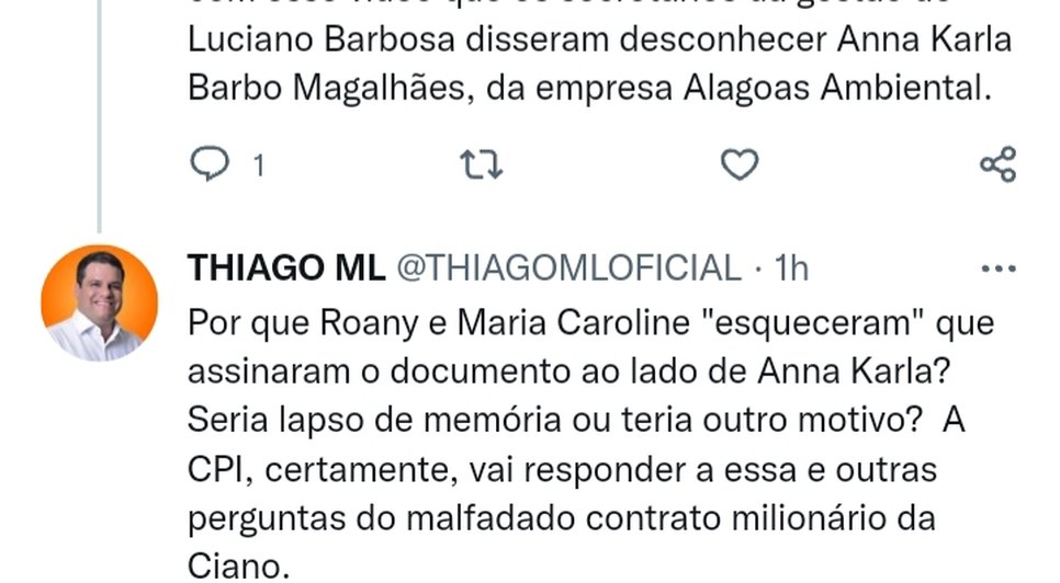 Essa não é a primeira vez que Thiago critica Luciano Barbosa: Conhecido por ser parte da oposição de Barbosa em Arapiraca, o vereador já havia postado em sua rede social, no dia 18 de Janeiro, sobre a CPI do Lixo: "A Prefeitura de Arapiraca ainda não conseguiu construir uma narrativa plausível para o tenebroso contrato milionário da limpeza urbana com a Ciano. São cerca de R$ 40 mi pagos em um conluio que vamos expor as vísceras na CPI. Não adianta criar fake news financiadas com erário."