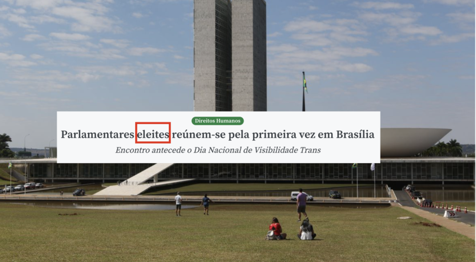 A produtora estatal de notícias, Agência Brasil, adotou a linguagem neutra conhecida também como linguagem não binária, na criação de uma repórter sobre um evento que reunia congressistas LGBTQIA+ eleitos. “Parlamentares eleites reúnem-se pela primeira vez em Brasília”, diz o título da reportagem.