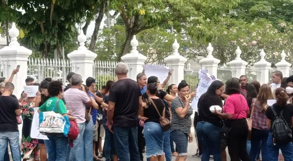 Profissionais da educação que estão sem salário protestam em frente ao Palácio do Governo