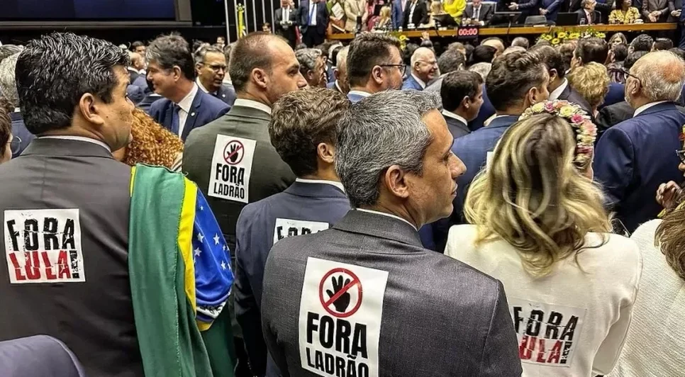 Bolsonaristas exibem cartazes "Pacheco não" e "fora Lula" durante posse na Câmara dos deputados