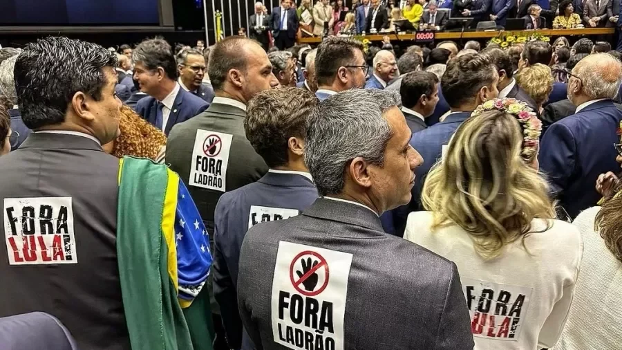O deputado federal Eduardo Bolsonaro (PL-SP) e outros deputados bolsonaristas levaram cartazes para a cerimônia de posse na Câmara dos deputados nesta quarta-feira (01).