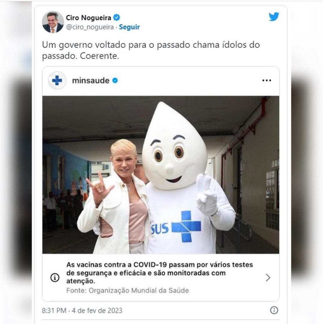 No último sábado (4/2), o ex-ministro de Jair Bolsonaro, Ciro Nogueira, utilizou as redes sociais para atacar Xuxa, após a apresentadora ser convidada pelo presidente Luiz Inácio Lula da Silva (PT) para ser embaixadora da campanha de vacinação no Brasil.