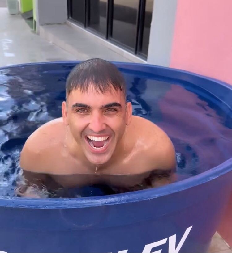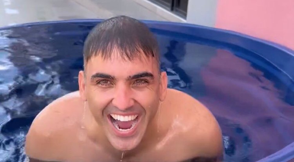 Ele compartilha um video aproveitando um churrasco dentro de uma caixa d'água acompanhado de um grupo de amigos na porta de sua casa, em frente a praça da cidade.