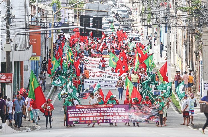 Mulheres do Movimento Sem Terra (MST) marcharam no Centro de Maceió, na manhã desta terça-feira (07). O ato aconteceu de forma pacífica e chama atenção para pautas como a luta pela vida e contra a fome.