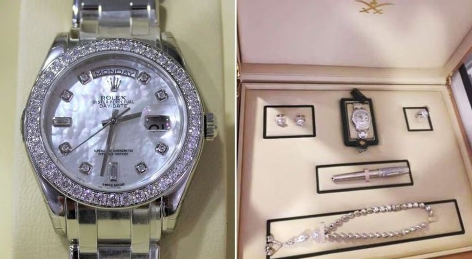 Neste terceiro conjunto estavam o relógio Rolex do modelo Oyster Perpetual Day-Date, que varia entre R$ 320 mil e R$ 360 mil. Além do acessório, o estojo de madeira grafado com o símbolo da Arábia Saudita apresentava uma caneta Chopard, abotoaduras, anel e uma espécie de rosário árabe. Ao todo, os pertences alcançam a cifra de R$ 500 mil.