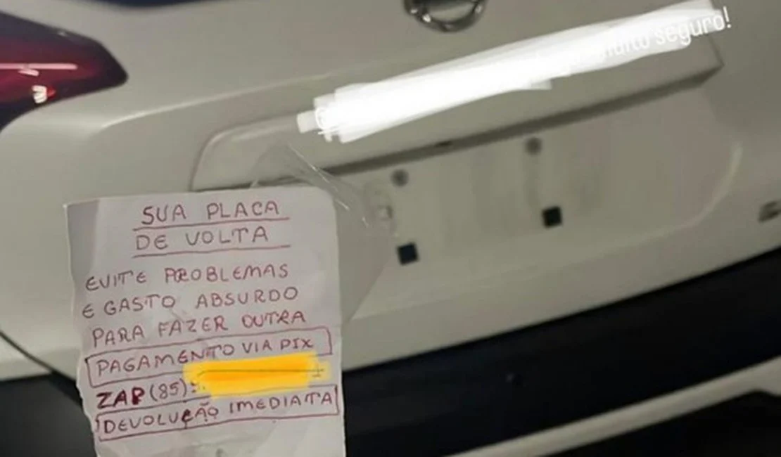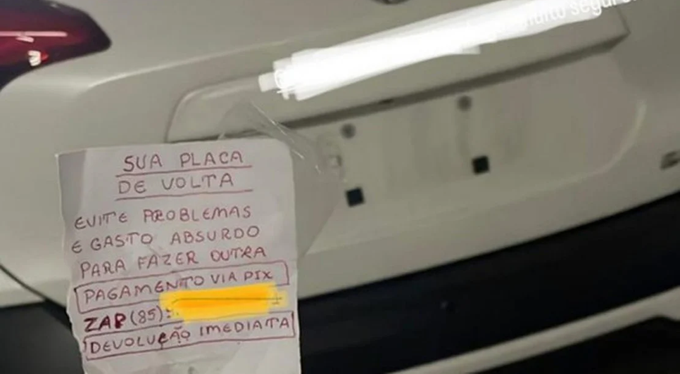 Criminoso furta placa de carro e deixa bilhete exigindo resgate: 'devolução imediata'
