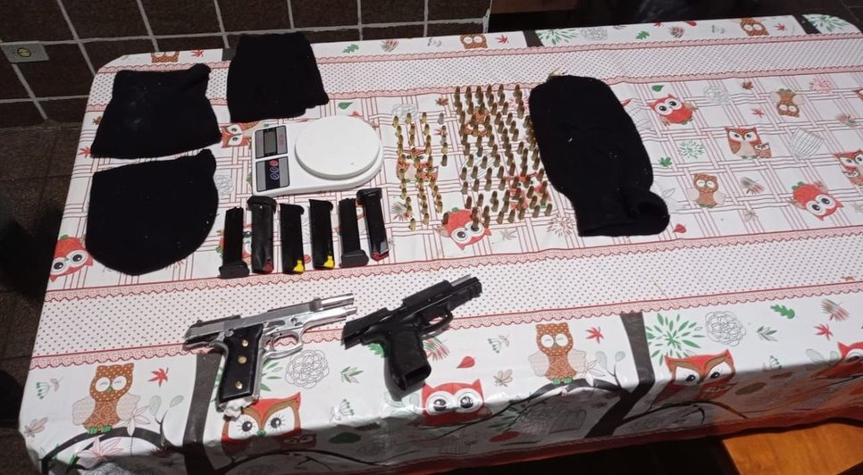 Foram apreendidos quase 26 quilos em drogas, uma grande quantidade de munições, duas pistolas, um revólver e uma espingarda, assim como quatro balanças de precisão, três celulares, quatro balaclavas, R$ 461 em espécie e um vidro com substância vermelha não identificada.