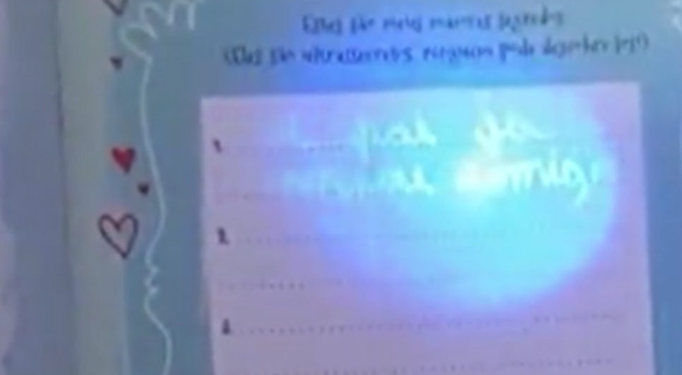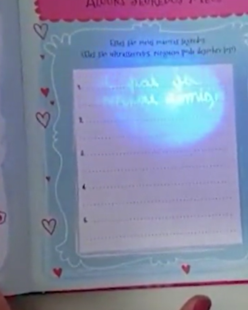 A descoberta foi feita por meio de um “diário mágico” que a menina possui. O objeto vem junto de uma caneta, que mantém tudo que é escrito "invisível ", na ideia de manter guardados os segredos da sua dona. O produto também vem com uma luz azul, presente na tampa da caneta que permite a visualização do que foi escrito com ela. Utilizando a caneta, a menina escreveu o que estava acontecendo “Meu pai já transou comigo”.