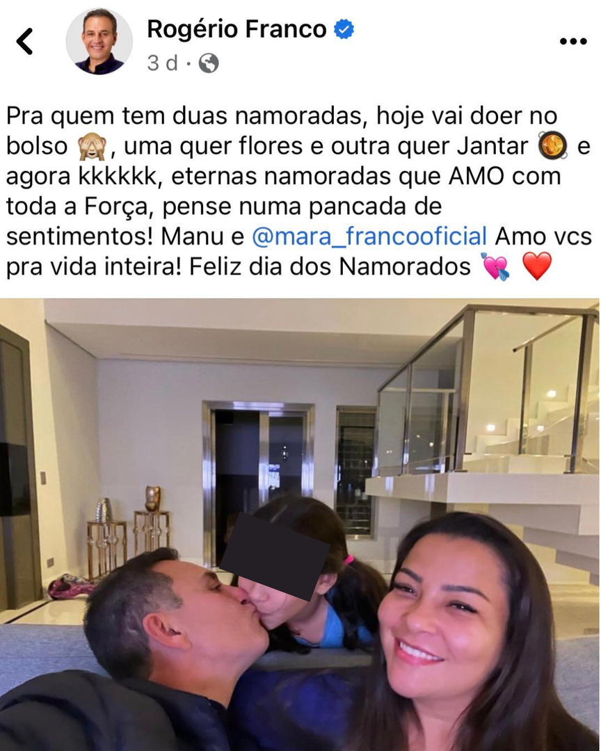 O prefeito de Cotia-SP, Rogério Franco, foi criticado nas redes sociais por beijar a filha na boca numa foto postada no Dia dos Namorados em que a esposa também estava presente.
