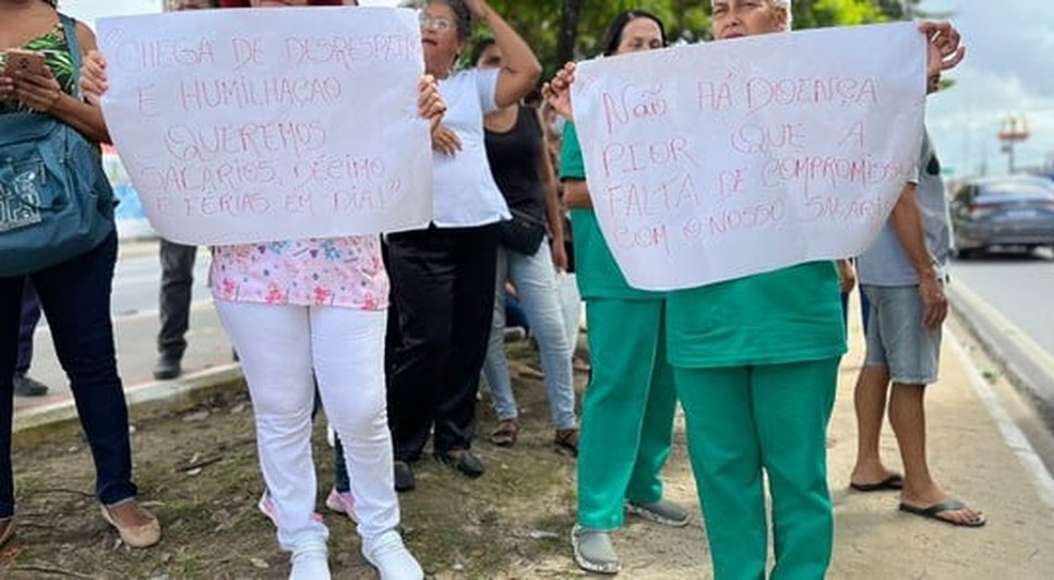 A equipe do Hospital Veredas fez protesto na manhã desta sexta-feira (16) em frente ao hospital, em Maceió. Os trabalhadores estiveram no local desde as sete da manhã, carregando faixas exigindo a normalização dos salários, que está atrasada desde março.