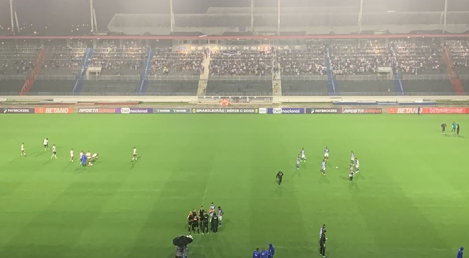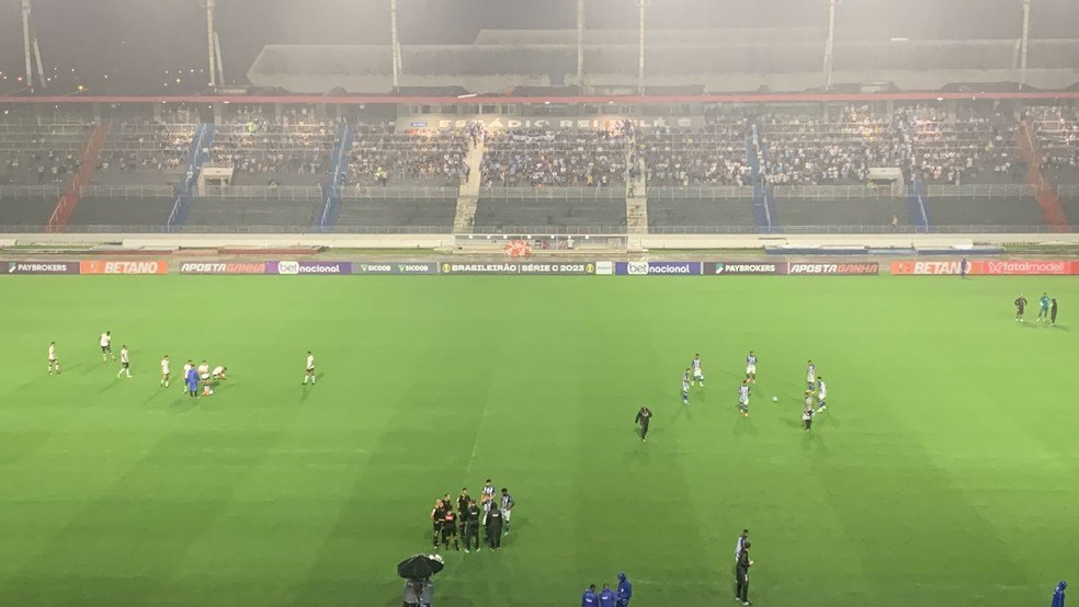 Depois de 17 minutos de espera, debaixo de chuva, um funcionário iniciou a marcação lentamente, com um carrinho. O árbitro pernambucano Paulo Belence Alves decidiu adiar a partida, após 1 hora e 15 minutos de espera.