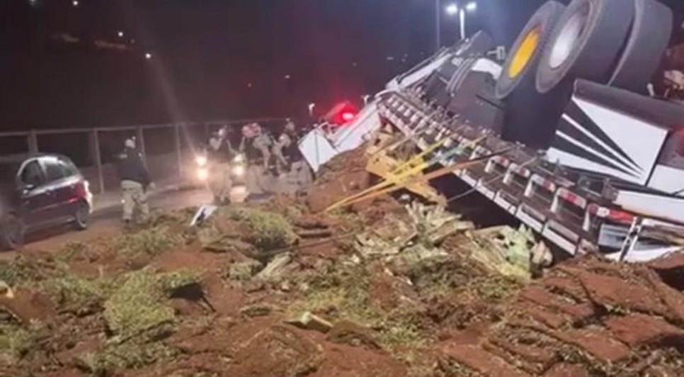 Na noite deste domingo(25), um caminhão que transportava cerca de 1 tonelada de maconha tombou em frente ao Batalhão da Polícia Militar de Juiz de Fora, Minas Gerais.