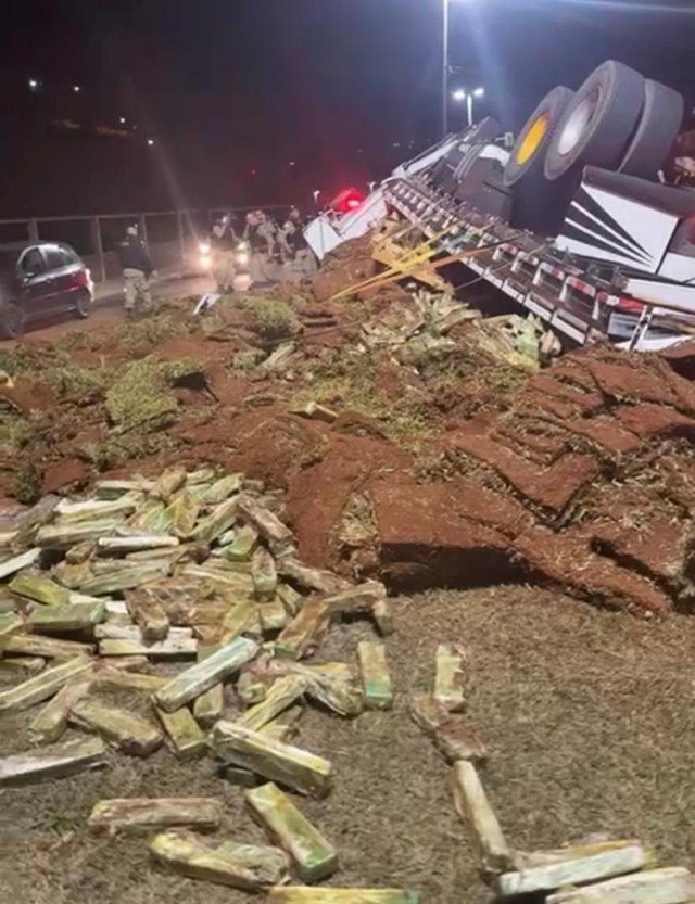 Foram apreendidas 1.235 barras de maconha, com cerca de 1kg cada uma. As drogas estavam escondidas em meio a carga de grama que o caminhão transportava e, com o tombamento, ficaram espalhadas na Av. Juscelino Kubitschek(JK).