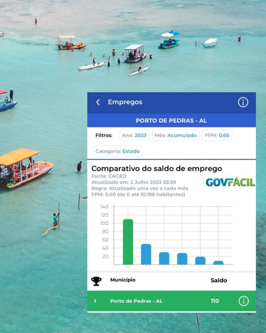 Pelo segundo mês consecutivo, o município de Porto de Pedras é destaque na geração de emprego na região norte de Alagoas. A alta oferta tem, inclusive, atraído trabalhadores das cidades vizinhas, que buscam ocupações. Porto de Pedras ocupa o primeiro lugar no ranking da plataforma de gestão pública Govfácil.