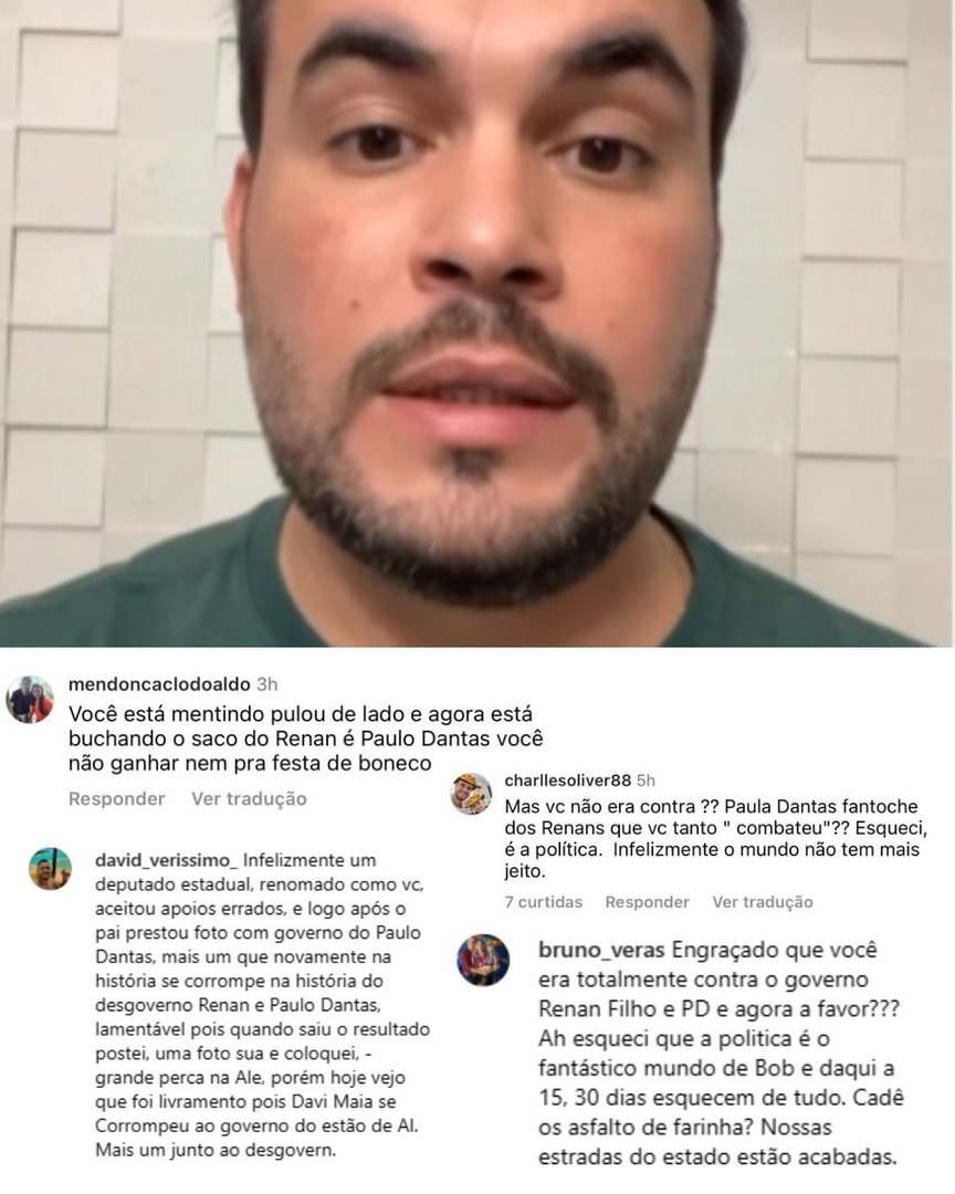 “Você está mentindo. Pulou de lado e agora está puxando o saco do Renan e Paulo Dantas. Você não ganha nem pra festa de boneco”, escreveu Clodoaldo Mendonça. Já Charles Oliveira questionou o novo grupo político de Davi Maia: “Mas vc não era contra ?? Paula Dantas fantoche dos Renans que vc tanto "combateu"?? Esqueci, é a política. Infelizmente o mundo não tem mais jeito”.