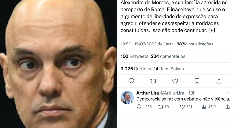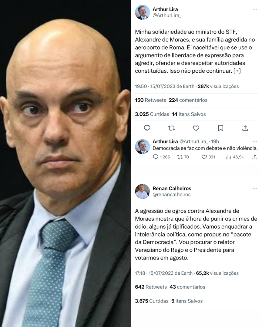 Após o ministro do Supremo Tribunal Federal (STF), Alexandre de Moraes, ser hostilizado e chamado de "bandido, comunista e comprado" por um grupo de brasileiros no Aeroporto Internacional de Roma, na Itália e seu filho, ter sido agredido fisicamente, políticos alagoanos expressaram seu repúdio nas redes sociais.