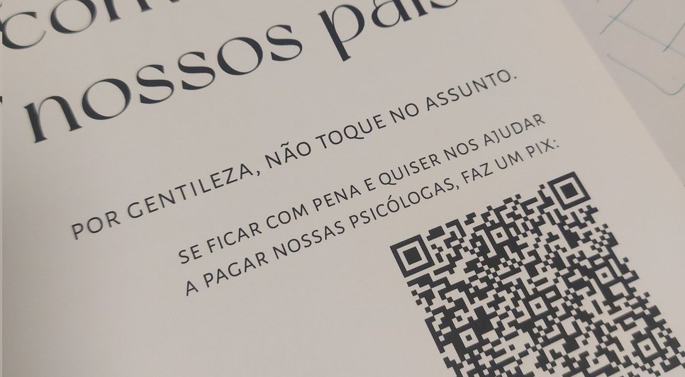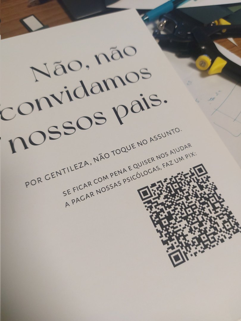 Na peça, o casal Anna Guimarães e Marcelo Frantz esclarece uma situação para eveitar que apareçam dúvidas quanto a isso: "Não, não convidamos nosso pais. Por gentileza, não toque no assunto". Na continuidade o casal avisa que se os convidados sentirem pena, podem contribuir para eles paguem as suas psicólogas e há um código de QRCode logo abaixo.