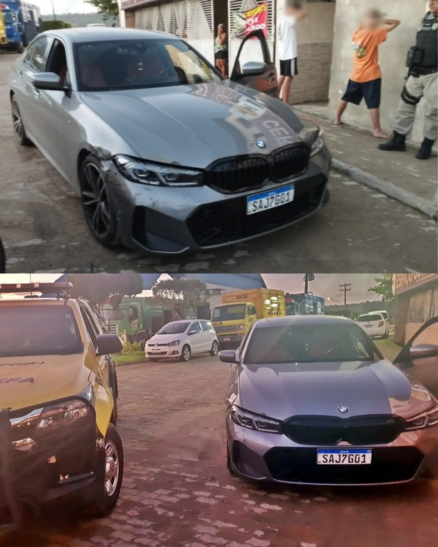 Um adolescente conduzindo um carro da BMW, com modelo da 320i M Sport, avaliado em cerca de R$360 mil, bateu em uma viatura da Polícia Militar na cidade de São Miguel dos Campos, interior alagoano, nesta segunda-feira (24).