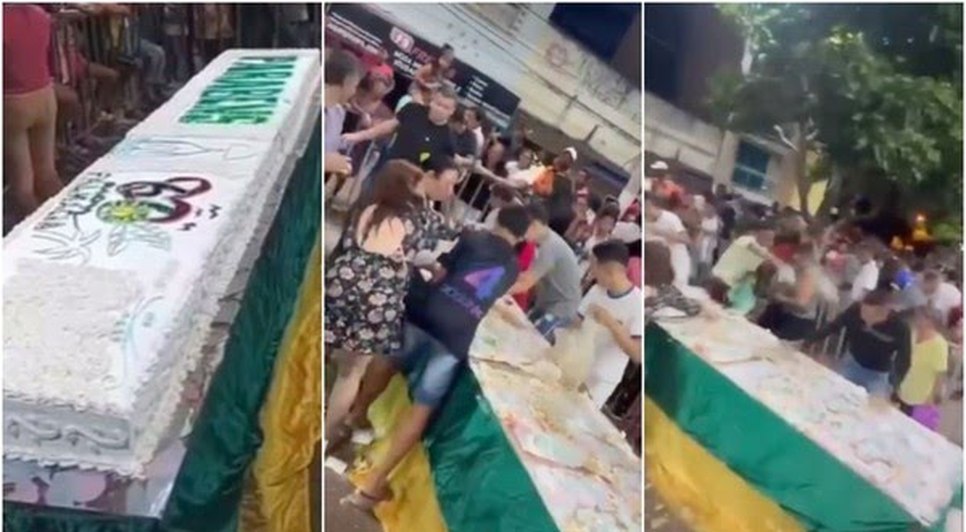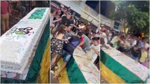 Segundo um morador, a tradição da distribuição de bolo é antiga e teve gente que chegou cedo para pegar uma fatia. As imagens geraram milhares de visualizações nas redes sociais e comentários bem humorados.