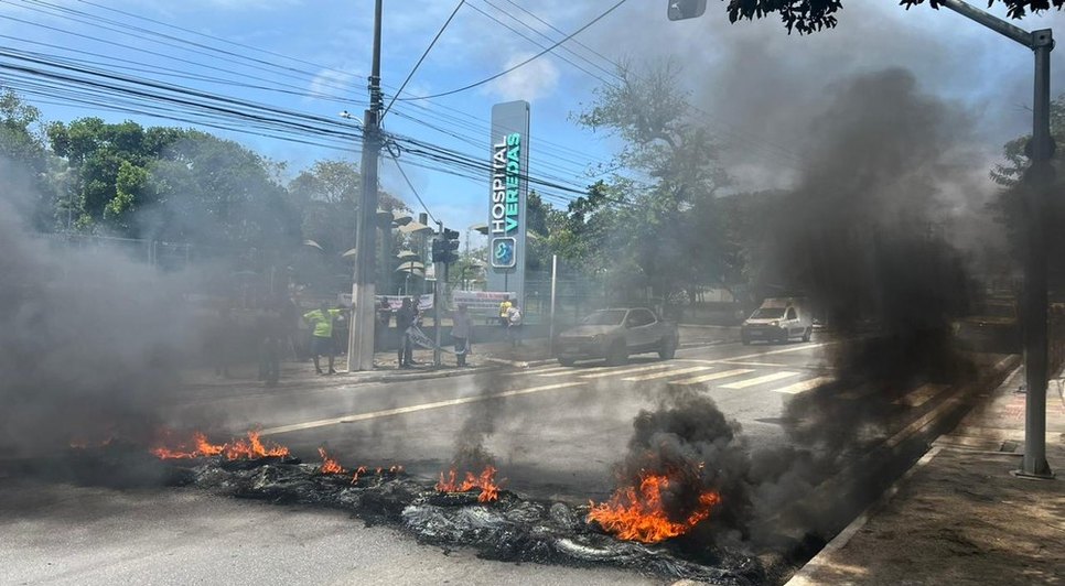 Ex-funcionários do Hospital Veredas bloquearam um dos sentidos da Avenida Fernandes Lima, em Maceió, na manhã desta segunda-feira (04). Os manifestantes chegaram por volta das 9h30 e atearam fogo a pneus para interditar o trânsito no sentido tabuleiro.