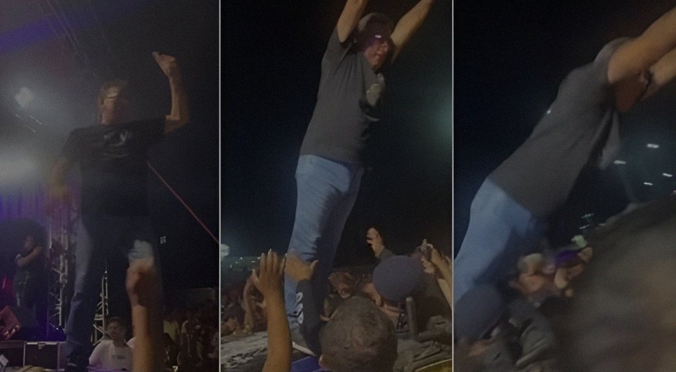Prefeito que se jogou na plateia e não foi segurado diz que “foi uma demonstração de carinho do povo.”