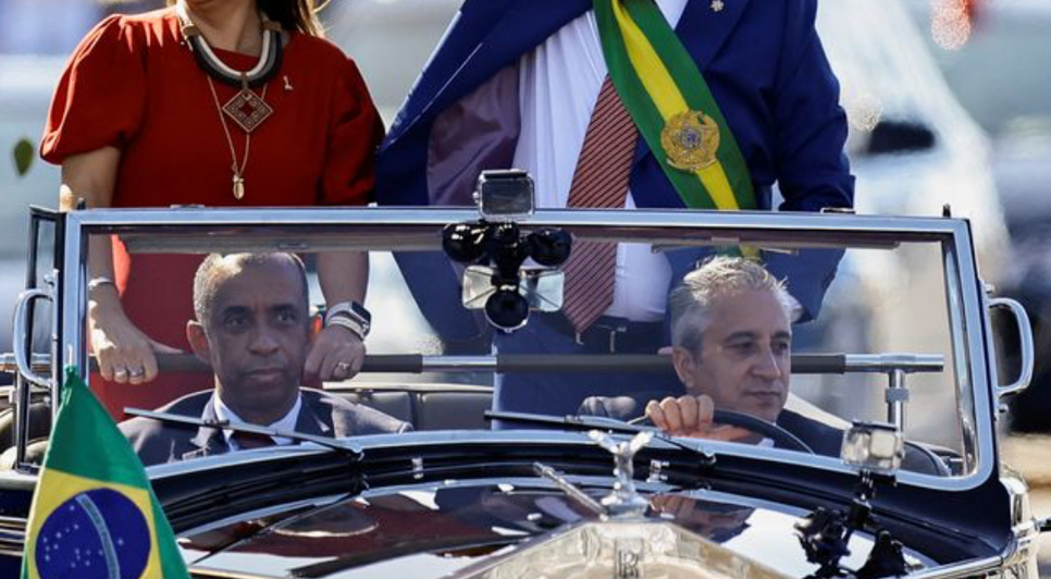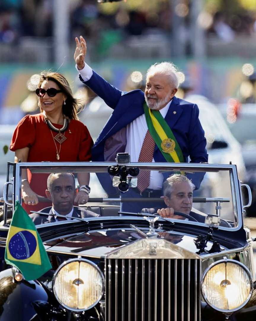 Lula acompanha o desfile ao lado dos presidentes do Congresso, Rodrigo Pacheco, e do Supremo Tribunal Federal, Rosa Weber, além dos comandantes das Forças Armadas, general Tomás Paiva (Exército), almirante Marcos Olsen (Marinha) e brigadeiro Marcelo Damasceno (Aeronáutica). A cerimônia teve início com a chegada do presidente no Rolls Royce presidencial, acompanhado da primeira-dama, Rosângela Silva, a Janja, que vestiu vermelho — cor do PT — e fez o sinal do "L" com os dedos a apoiadores, numa alusão ao símbolo usado para identificar o voto em Lula na campanha eleitoral.