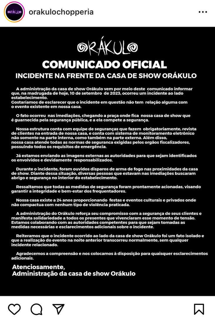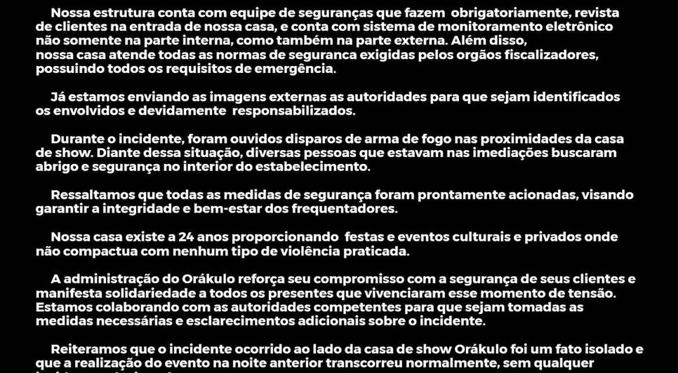 A Orákulo Chopperia se pronunciou, por meio de nota nas redes sociais devido a situação que deixou um morto e dois feridos a tiros, na madrugada deste domingo (10), no estabelecimento, situado no Jaraguá. A casa de show, no entanto, informou que a ocorrência foi registrada na parte externa da festa e que vai fornecer imagens de câmeras de segurança para a polícia, a fim de contribuir na identificação dos suspeitos.