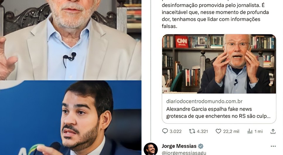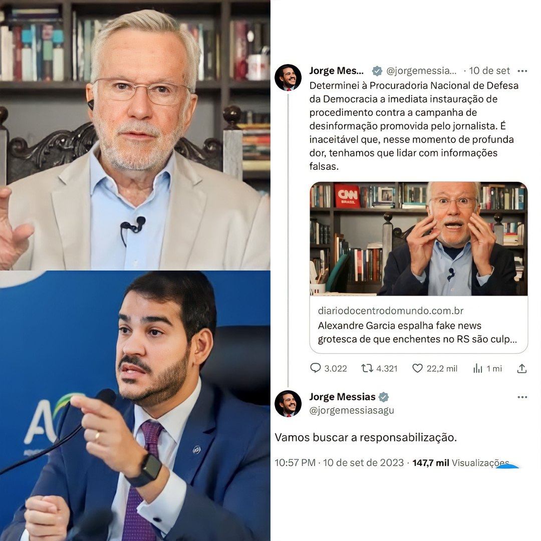 O advogado-geral da União, Jorge Messias, informou, na noite desse domingo (10), que determinou à Procuradoria Nacional de Defesa da Democracia que investigue o jornalista Alexandre Garcia, da Revista Oeste, em razão de uma "campanha de desinformação promovida" pelo repórter. A ação foi motivada por um comentário do jornalista sobre as chuvas que atingem o Rio Grande do Sul. De acordo com o boletim da Defesa Civil do Rio Grande do Sul, até as 18h30 desse domingo, 46 pessoas morreram em decorrência da tragédia. Além disso, 4.794 pessoas estão desabrigadas; e 20.490, desalojados.